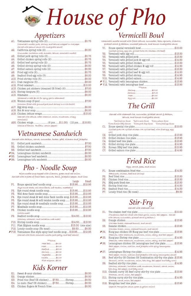 Vegetarians can savor meals like tofu lettuce wraps or vegetarian spring rolls. Kids can indulge with a tailored menu including sweet and sour chicken. House of Pho focuses on quality and fresh ingredients in every dish, ensuring satisfaction with each bite.