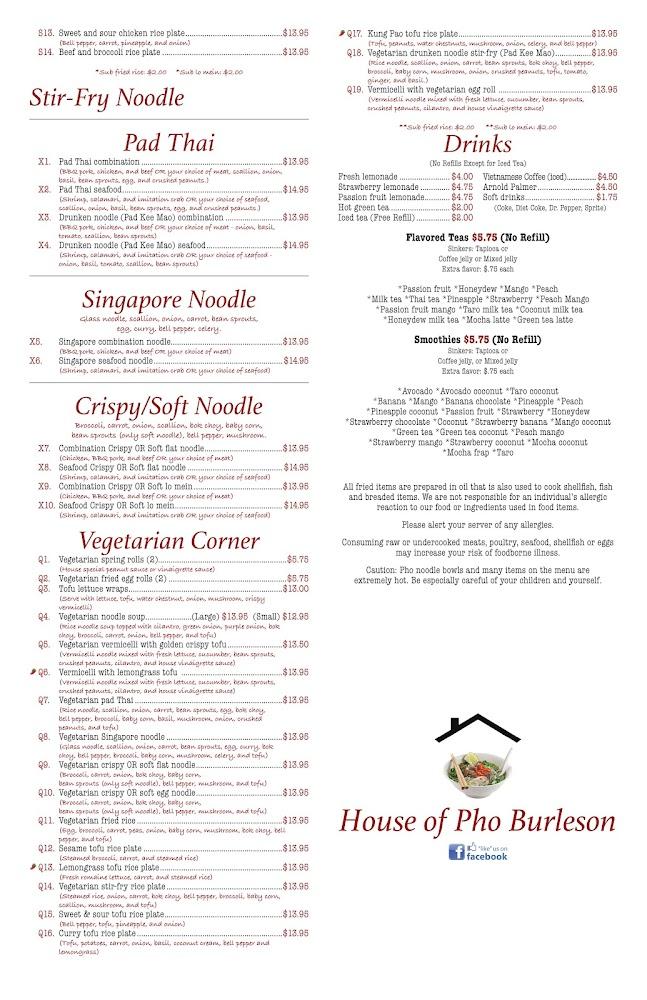 Welcome to House of Pho, your ultimate destination for authentic Vietnamese cuisine in Burleson, TX. Located at 12848 South Fwy #200, we specialize in delicious pho and a diverse menu that caters to every palate, including vegetarian options. Enjoy a relaxed, family-friendly atmosphere perfect for lunch or dinner, whether you’re dining solo or with friends. Our swift service, extensive tea selection, and traditional dishes make for an unforgettable experience. We offer dine-in, takeout, and delivery, and our premises are fully accessible. Join us today to savor the vibrant flavors of Vietnam!